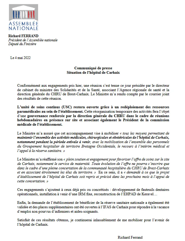 Le communiqué de Richard Ferrand sur la situation au CHU de Carhaix.