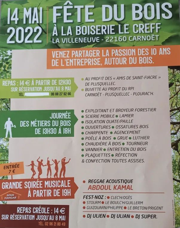 La boiserie Le Creff et plusieurs associations (Stourm, les amicales laïques de Plusquellec, Carnoët et Plourac'h ainsi que les amis de la chapelle Saint-Fiacre de Plusquellec) organisent la 2e édition de la fête du bois.