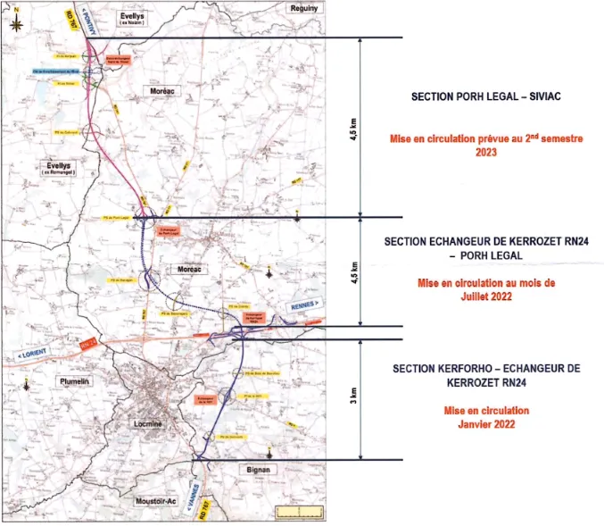 Depuis janvier 2022, trois kilomètres étaient mis en service entre la section de Kerforho et l'échangeur de Kerrozet. Ce mercredi 6 juillet, c'est un peu plus de quatre kilomètres qui sont ouverts à la circulation entre l'échangeur de Kerrozet et Porh Legal. Il reste encore le dernier tronçon entre Porh Legal et Siviac, mise en circulation prévue pour 2023.