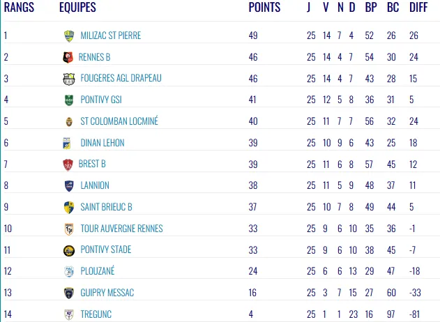 Dans le bas du classement, les trois équipes reléguées sont déjà connues, Trégunc, Plouzané et Guipry-Messac. Mais il pourrait bien y avoir une quatrième descente. En effet, si Saint-Malo, club de National 2, venait à être relégué il faudrait compenser et la 11ème place de ce groupe K de N3 pourrait être synonyme de relégation. Pour l'instant, c'est le Stade Pontivyen qui est dans cette postion, à égalité de points avec la TA Rennes. Il reste donc encore des matchs à enjeux mais dans le milieu de classement, l'objectif va surtout être de terminer la saison sur une bonne note. C'est le cas de la GSI Pontivy pour le dernier match de son entraîneur Stéphane Le Garrec qui ne poursuivra pour une 4ème saison. Autre départ dans le staff, Hugues Prévost, qui sera adjoint de Stéphane Le Mignan à l'US Concarneau pour la prochaine saison de National 1. Clotaire Duclovel, disputera également son dernier match avec les Verts et Blancs.