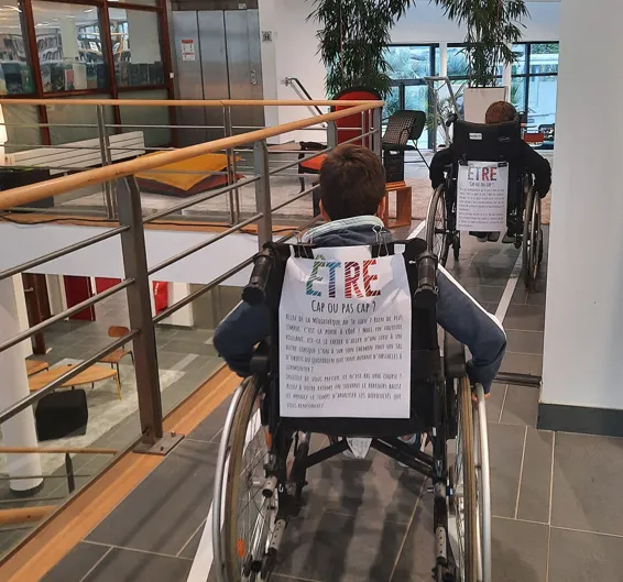 Depuis le mois de novembre, l'Archipel détient 3 fauteuils roulants. Plus utilisés par des personnes à mobilité réduite, ils peuvent néanmoins servir pour ce genre d'action de sensibilisation, et ont été offerts à la médiathèque par Yann Jondot, l'ambassadeur de la mobilité, et ancien maire de Langoelan.