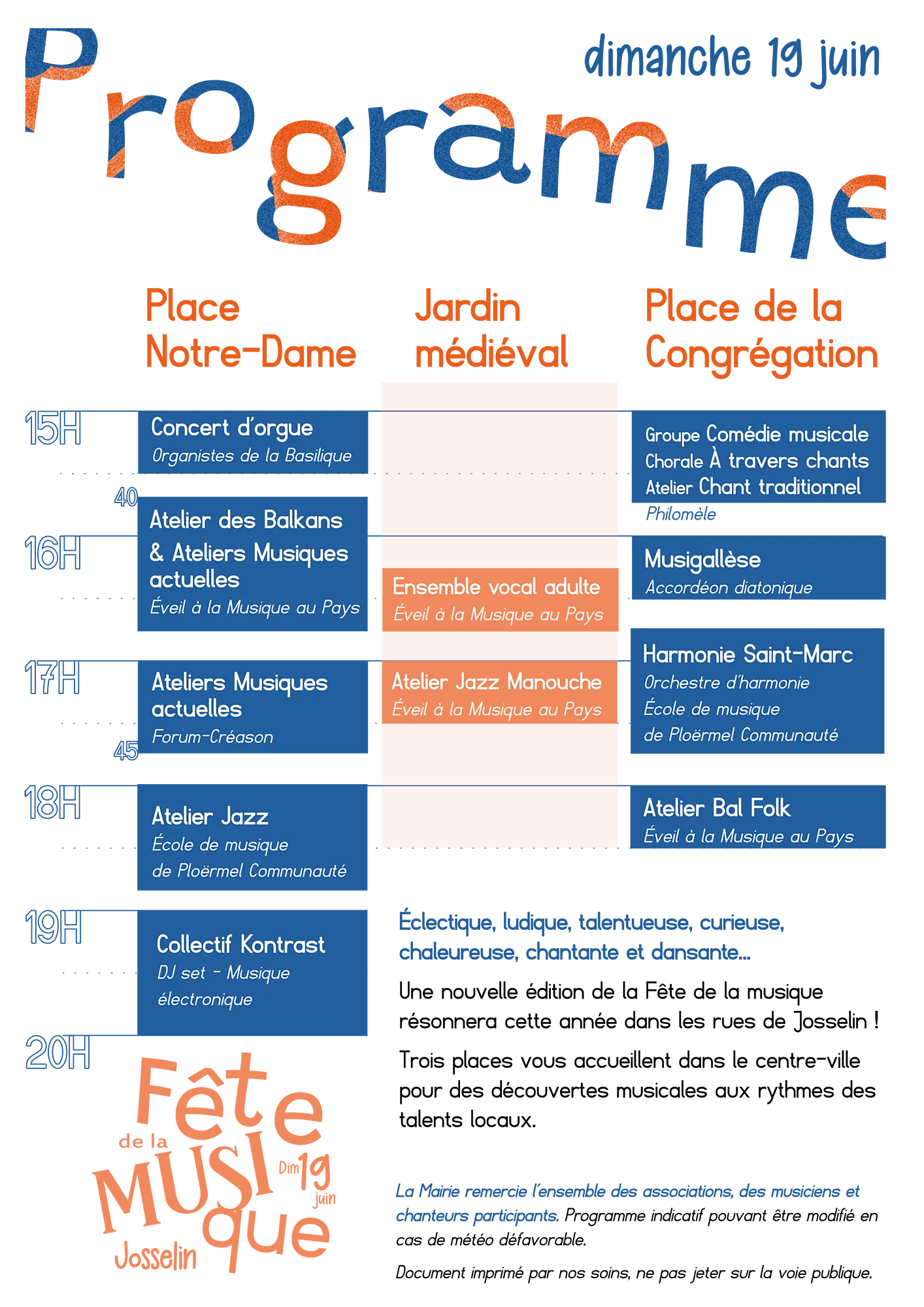 Trois scènes, plus de cinq heures de spectacles et des groupes locaux, c'est le programme de la Fête de la musique de Josselin le dimanche 19 juin. La municipalité a fait le choix d'impliquer les associations de pratiques musicales locales pour aider à organiser et animer cette journée. Au programme différents types de musiques, du jazz au rock, en passant par la musique traditionnelle Bretonne à l'électro, il y en aura pour tout le monde.