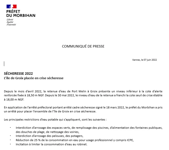 A la suite des fortes chaleurs connues dans la région depuis de nombreuses semaines, l'île de Groix a été placée en crise sécheresse, annonce ce mardi la Préfecture du Morbihan dans un communiqué.