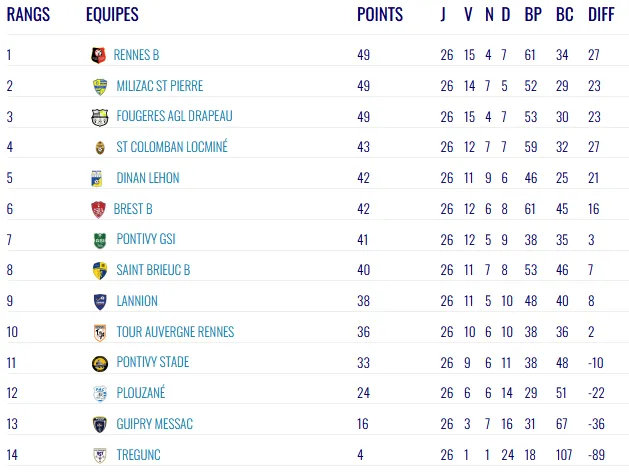 Dans le bas du classement, la victoire de la TA Rennes leurs assure la 10ème place synonyme de maintient. C'est le Stade Pontivyen qui sera la quatrième équipe à descendre après leur défaite à Dinan- Léhon (3 - 0).