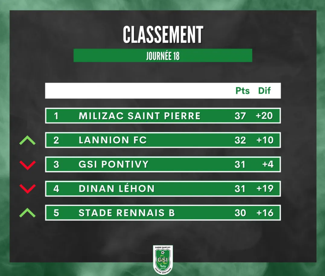 Au regard du classement, on remarque que la GSI et Dinan-Léhon comptent le même nombre de points après 18 journées, et on note surtout que Milizac a désormais une belle avance en tête de ce groupe de National 3.