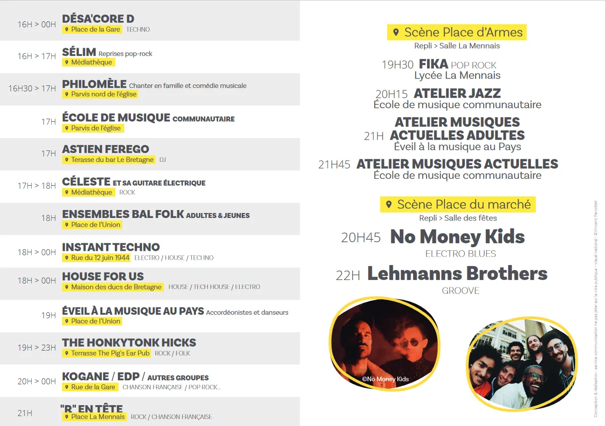 Sur la scène Place d'Armes, le lycée de La Mennais et l'école de musique communautaire vont se produire à partir de 19H30. Sur la scène Place du Marché, deux groupes plus confirmés avec No Monkey Kids, plus de 300 concerts à son actif et un 4ème album de prévu. Ils ont fait les premières parties de Cali, les festivals Art Rock et Rock en Seine. Ils proposent un style élctro blues. Puis, le groupe Lehmanns Brothers viendra clôturer la soirée dans un style funky groove hip-hop. Formé de six musiciens avec des cuivres notamment.