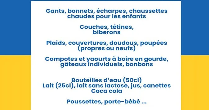 Des produits d'hygiène, des protections féminines, matériel médical de premiers secours, ou encore des couches, biberons, poussettes, lait en poudre et lait sans lactose sont les bienvenus.
