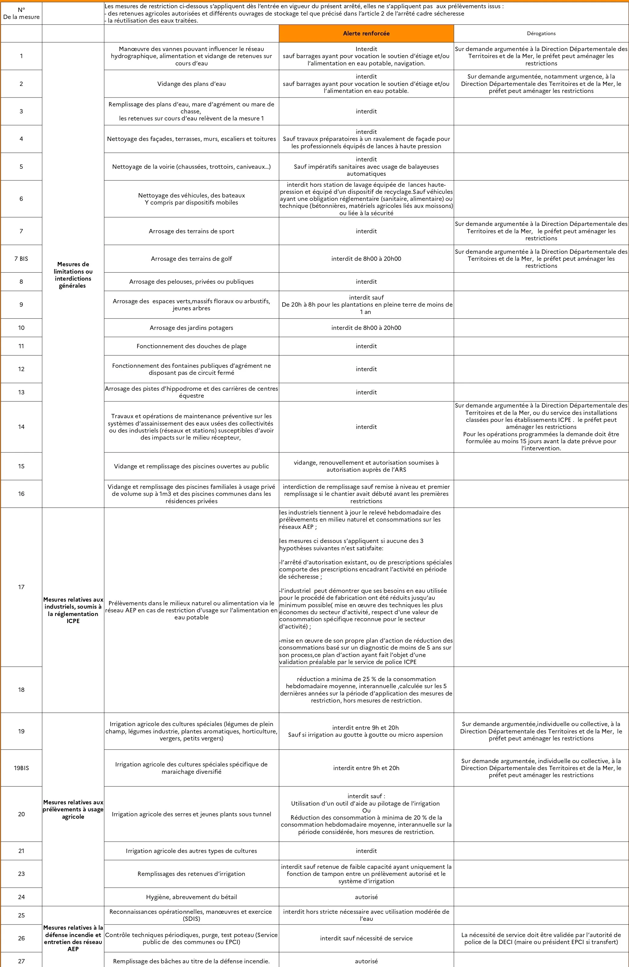 Ces mesures concernent notamment les départements du Finistère et du Morbihan, passés en état "d'alerte renforcée" par les préfectures. Pour les particuliers, interdiction d'arroser ou de nettoyer avec de l'eau entre 8 H 00 et 20 H00. Pour les exploitations agricoles, l'arrosage est interdit de 9 H 00 à 20 H 00 sauf avec un système de gouttes à gouttes. Les collectivités sont également concernées par les mesures d'arrosage et de nettoyage, les douches de plage sont aussi coupées. Pour les industriels, la consommation d'eau nécessaire doit être réduite de 25 %.